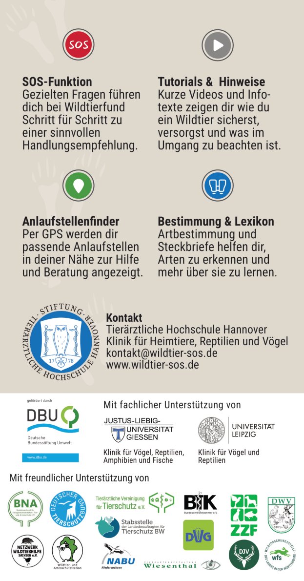 Zur Unterstützung von Findern Wildtiere hat die Tierärztliche Hochschule Hannover eine App entwickelt. Sie hilft dabei, beim Auffinden von Wildtieren besser zwischen tatsächlichen Notfällen und unproblematischen Situationen zu unterscheiden. Darüber hinaus bietet die App mithilfe einer GPS-Funktion Hinweise auf geeignete Versorgungsstellen, an die sich FinderInnen im Notfall wenden können.